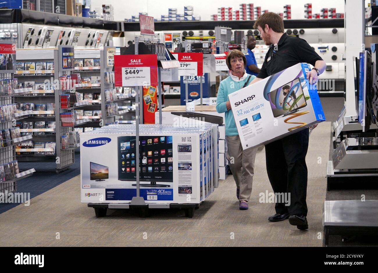 An Employee Helps A Customer With A Television At A Best Buy Store In Denver May 14 2015 Best Buy Co Inc The Largest U S Consumer Electronics Chain On May 21 2015